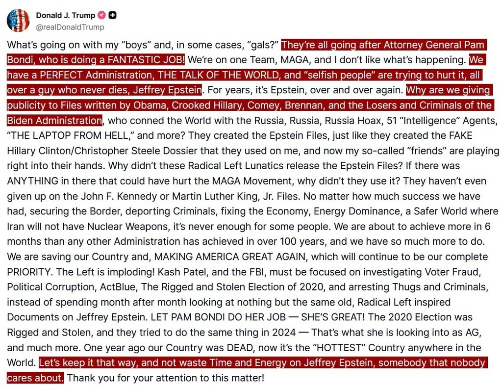 「他們全都在針對司法部長潘邦迪,而她明明做得非常出色...我們為什麼要去宣傳那些由奧巴馬、奸棍希拉莉、柯米、布倫南以及拜登政府那群失敗和罪犯者寫的東西?」