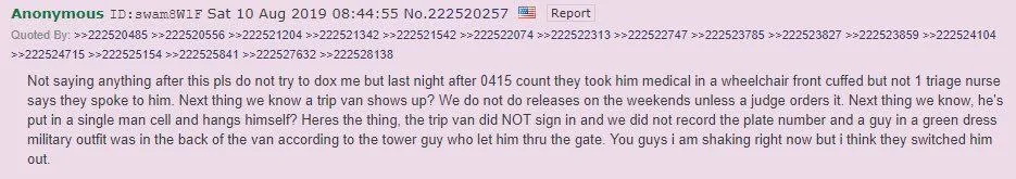 2019年8月10日,愛潑斯坦被發現死亡的2小時後,《8CHAN》網站上出現了一則來自大都會拘留中心的訊息。