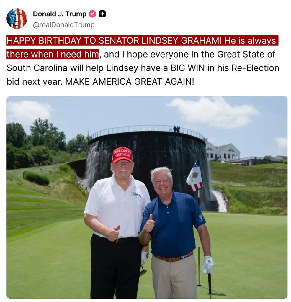 而如今,「特朗普」寫道:「生日快樂,格雷厄姆參議員!每當我需要他時,他總是在那裏。」